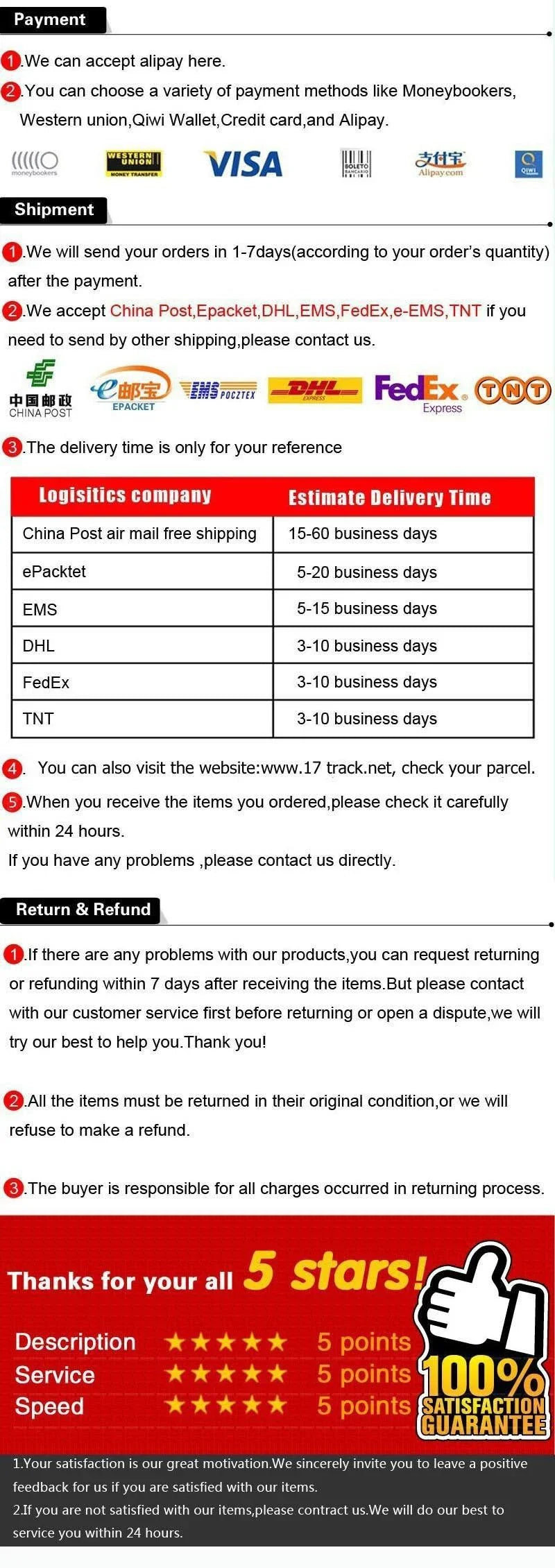 - Tracking: A tracking number will be provided once your order is shipped.